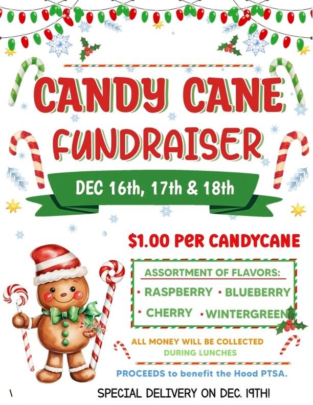 The GHH PTSA is sponsoring Candy Cane Grams to help celebrate the holiday season, giving students an opportunity to send a candy cane to their friends. Students may purchase Candy Cane Grams during lunches on Tuesday, Wednesday, and Thursday for $1.00 each. Purchased Candy Cane Grams will be delivered during Morning Meeting on Friday. Just another way to spread holiday cheer this week!